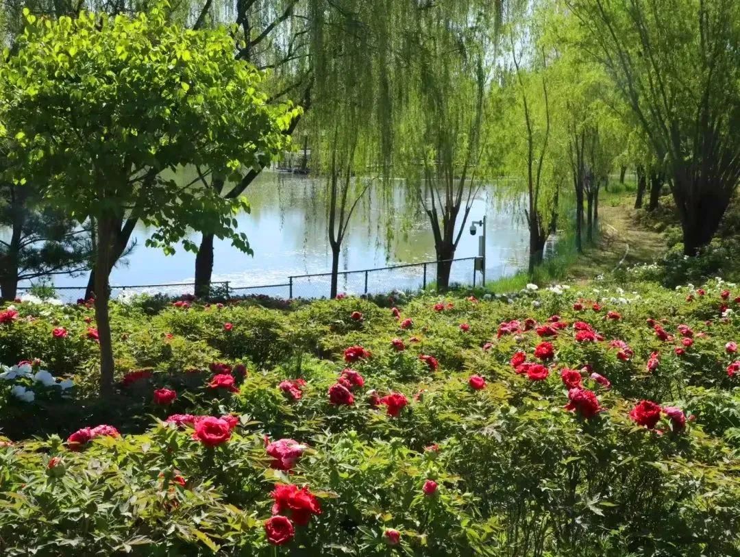 In March of this year, Dongjiang Park in Shunyi was approved as a national AAAA-level tourist attraction. On the green belt of over 20,000 square meters on the west bank of the park's large lake, peonies and peonies are in full bloom. Recently, over 100,000 peony plants have bloomed, covering a variety of precious varieties with rich colors. The flowering period is expected to last until around May 5th.