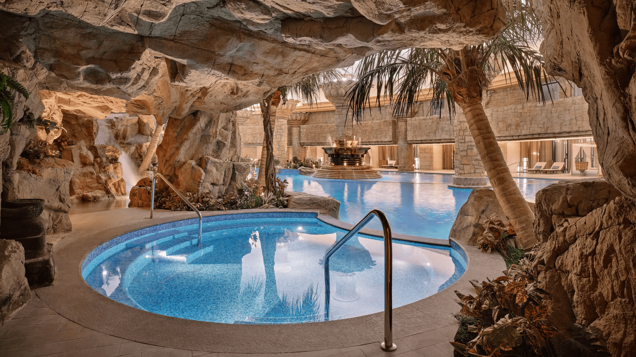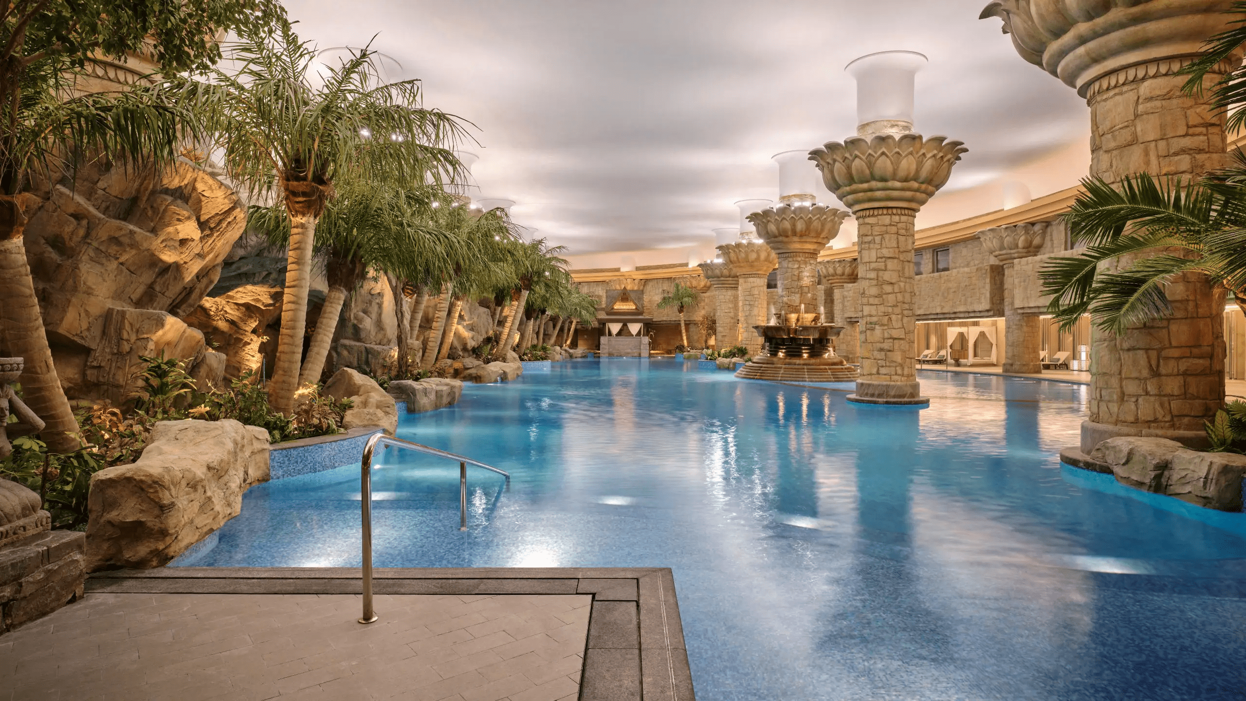 "Club Oasis Fitness Center & Spa's tropical rainforest-style indoor pool transports guests to a resort-like urban oasis. Surrounded by lush greenery, waterfalls, grand columns, and rock formations, the space is both immersive and relaxing. The fitness center is equipped with Technogym's advanced equipment, including the Skill Mill non-motorized treadmill, KINESIS ONE functional trainer, and Omnia3 multi-functional rack, supported by a professional coaching team. The spa provides an array of meticulously tailored body and facial treatments.