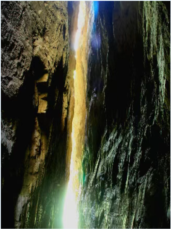 The temple faces east with mountains on all four sides. White clouds often encircle the mountains like a ribbon. The mountain strata have a gentle dip angle, with minimal folding, resembling layers of mille-feuille or volumes of books. The mountainside has exposed white marble strata.