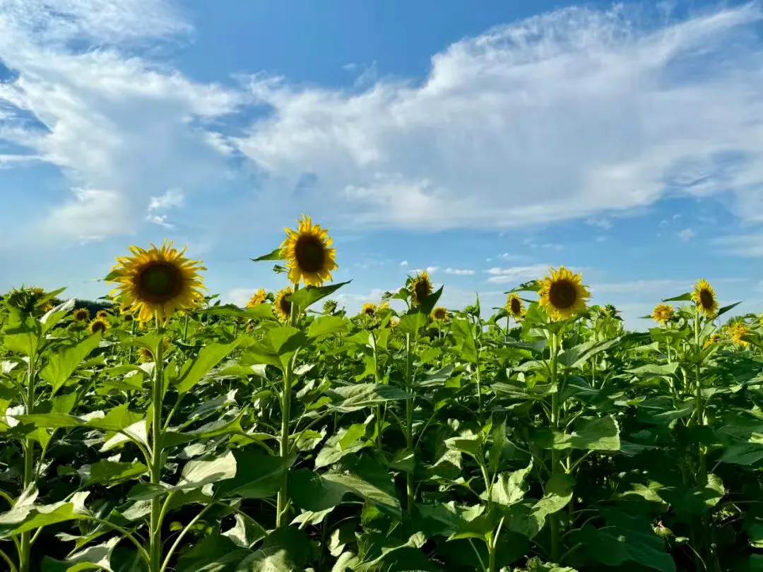 Standing in the flower field, it feels like being in a painting by Van Gogh, with full sunflower heads blooming freely under the sunlight. The golden petals gently sway in the breeze, creating the brightest landscape against the backdrop of the blue sky and white clouds.