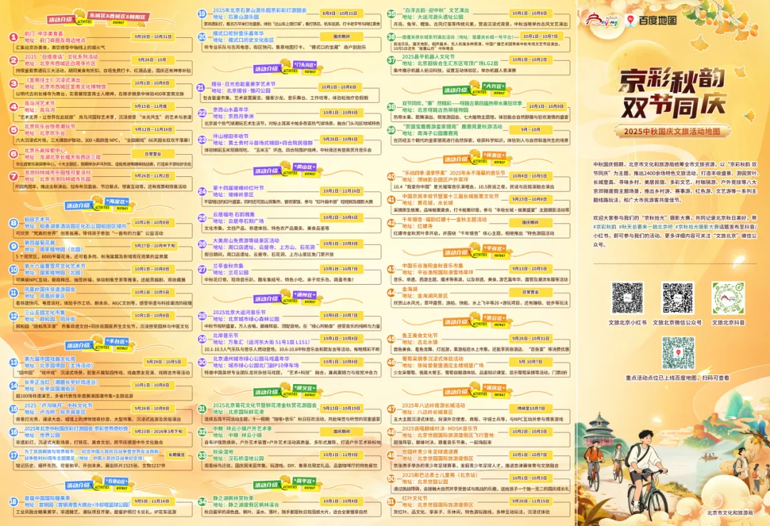 When the Mid-Autumn moonlight meets the National Day celebration, Beijing's autumn also welcomes a colorful carnival. The Beijing Municipal Bureau of Culture and Tourism, in collaboration with Baidu Maps, has launched the Mid-Autumn Festival and National Day Cultural Tourism Activities Map, featuring over 50 exciting activities online to help you plan a wonderful holiday journey, experiencing the infinite fun of strolling in Beijing and exploring the outskirts of the city.